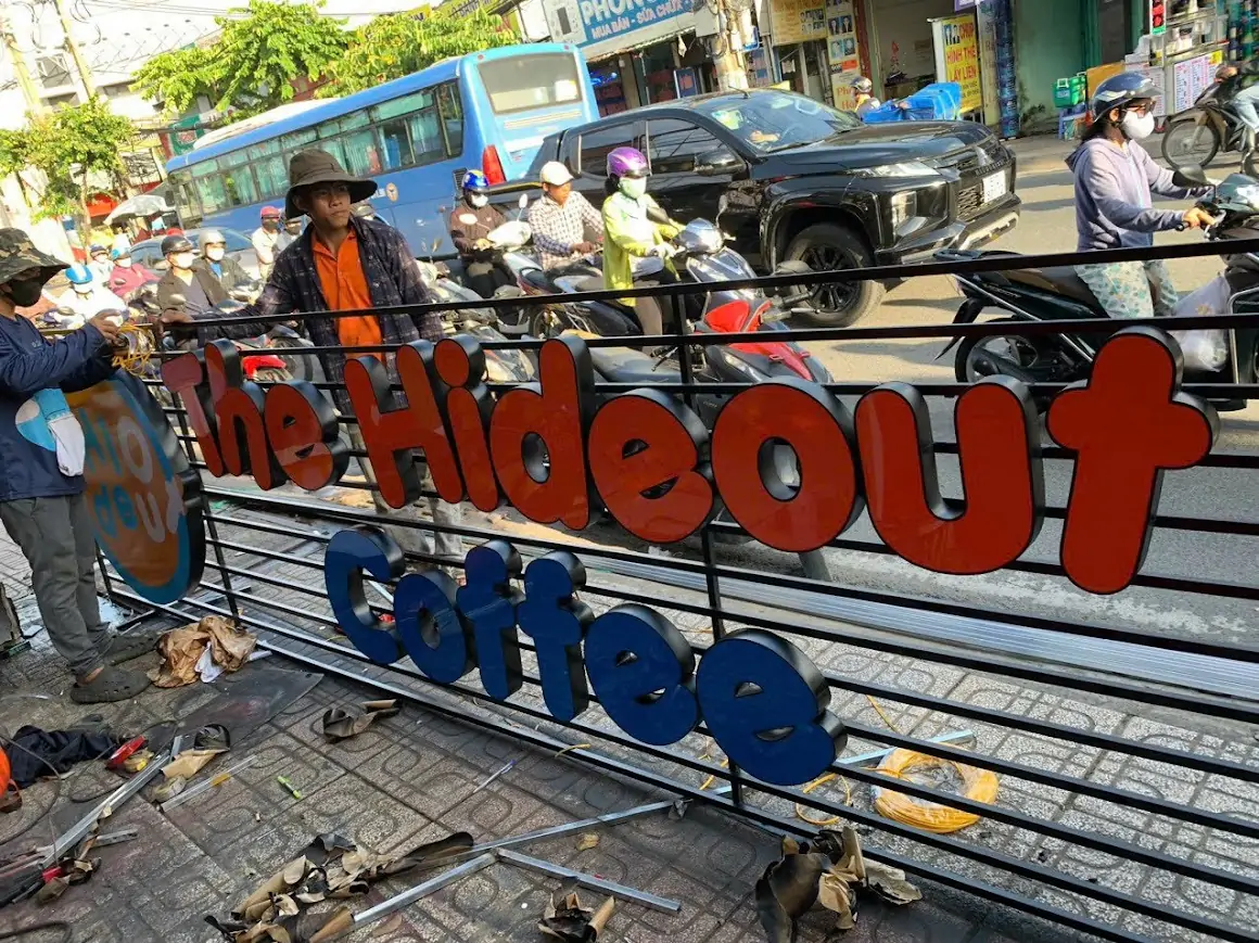 - Bảng hiệu Alu + chữ nổi mica/inoх gắn đèn LED: Giúp tên quán nổi bật cả ngày lẫn đêm.